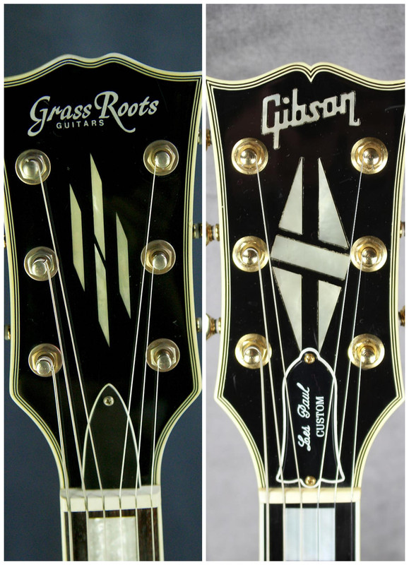 De kop wijkt iets af van de echte Gibson. Dit is meer een soort 'bovenlip vorm', i.p.v. de 'open book'. De binding loopt ook gewoon door, i.p.v. dat deze samenkomst in twee delen. Ik vind het eigenlijk wel mooier dan die van Gibson.