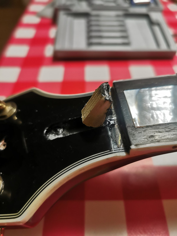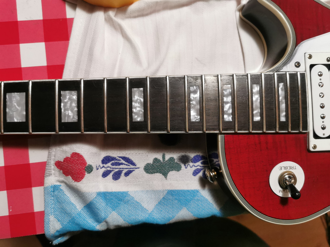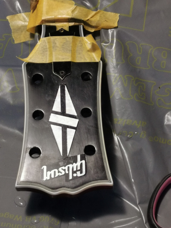 Die naam en dat alternatieve diamant ding op de kop vond ik niet zo mooi. Ik wilde het toch als Gibson hebben, dus ben ik gaan schuren, lakken en plakken.
