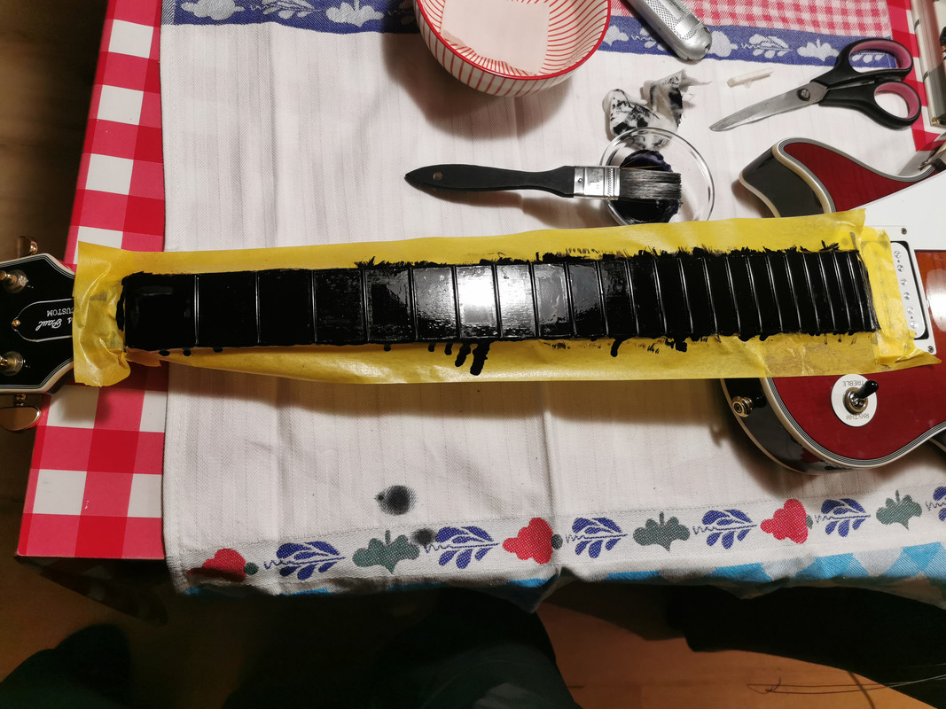 Omdat dit best een goedkoop gitaartje was, durfde ik het wel aan om te gaan schuren, spuiten en te beitelen etc. En dit is 'm uiteindelijk geworden: