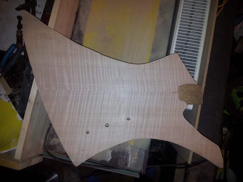 Nou, niet kunnen doen wat ik allemaal had willen doen, ik moest stil zijn. paar gaten geboord en met een fijn decoupeerzaagje de top wat strakker rondom de body gezaagd zodat ik minder hoef weg te frezen straks..