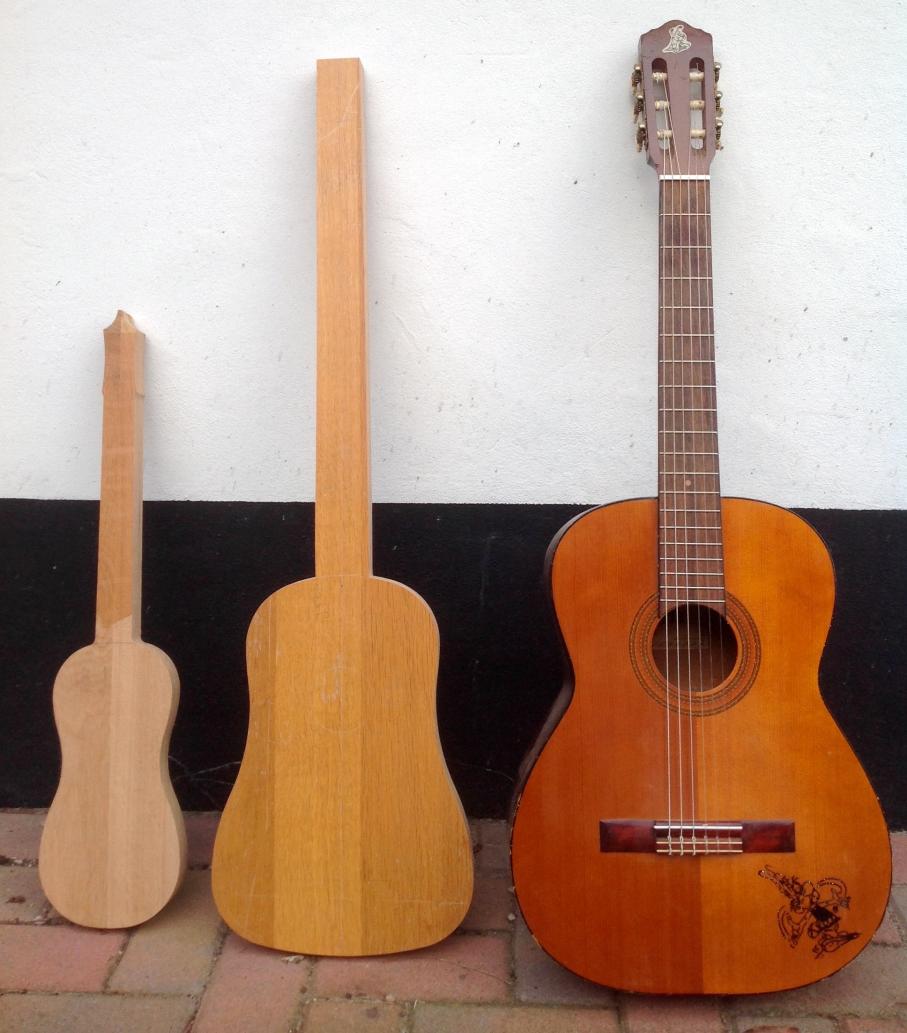 Ter vergelijking van de grootte naast een "normale" klassieke gitaar. De hals van de vihuela wordt nog ingekort, de uiteindelijke mensuur is 60cm).