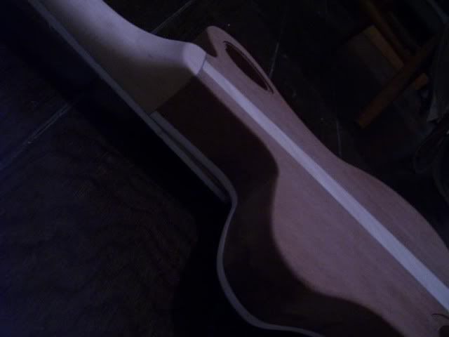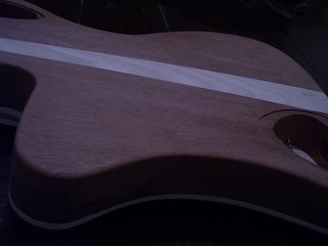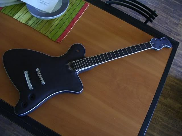 De gitaar is een eerste keer "tiefschwarz" gestaind. Viel goed mee maar ook wat tegen omdat ik langs de binding hier en daar nog wat superlijm zat en daar pakt stain niet op. dus: veel werk voor de boeg: knommelwerk nog wel ... Bovendien had ik de binding niet afgeplakt, dus dat moet ook nog opgeschoond worden.
