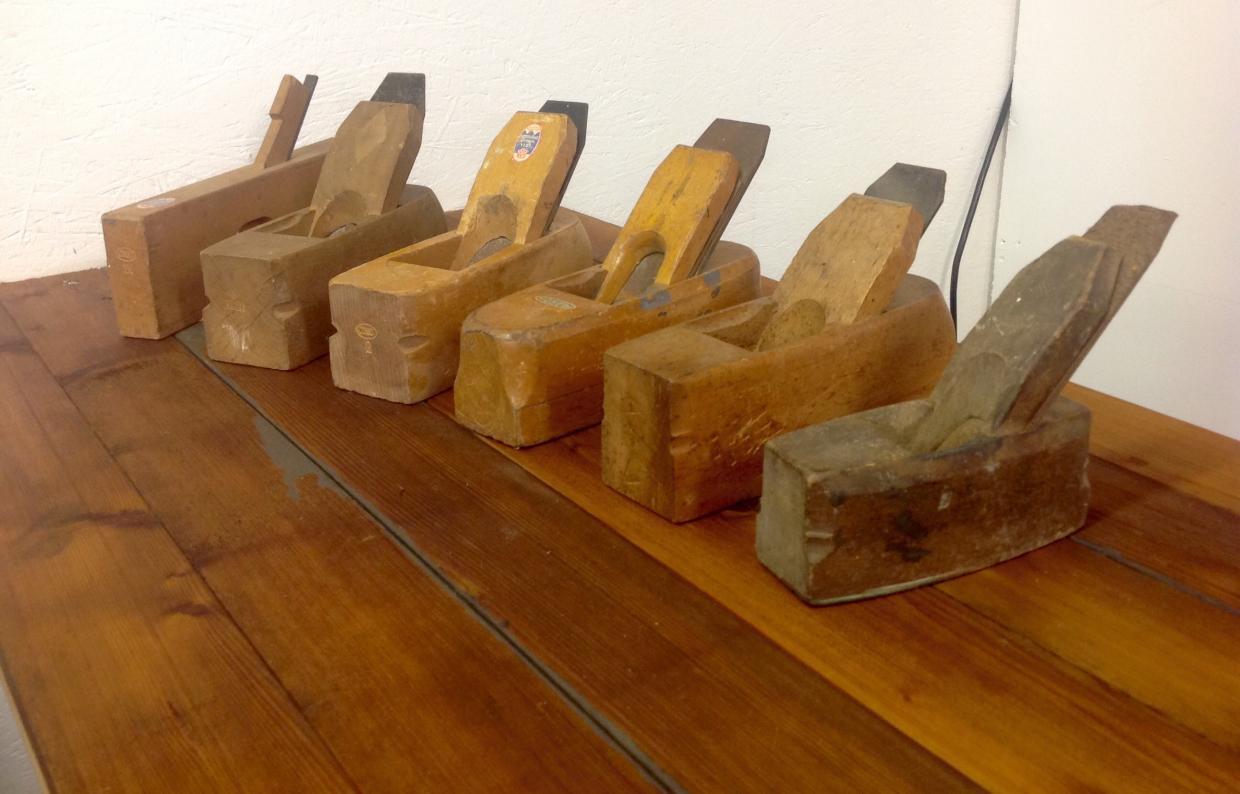 Hier ligt er een setje oude blokschaven. De drie achterste zijn van Nooitgedagt, het kleine schaafje op de voorgrond is gemerkt met "PS" die er achter een "HBS" en een "Marda". Denk er over deze toch maar eens op te knappen en te gaan gebruiken. Oude instrumenten vragen tenslotte om oude gereedschappen...