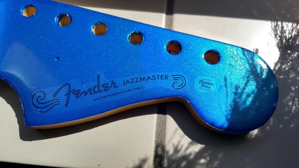 Kan het zijn dat het iets “relic” is? Bij oude fenders zie je door de veroudering namelijk de decals erbovenop liggen en misschien is het juist de bedoeling om dit effect te repliceren. Maar normaal gesproken hoort het niet te zien te zijn en ik denk niet dat het met polijsten verdwijnt.