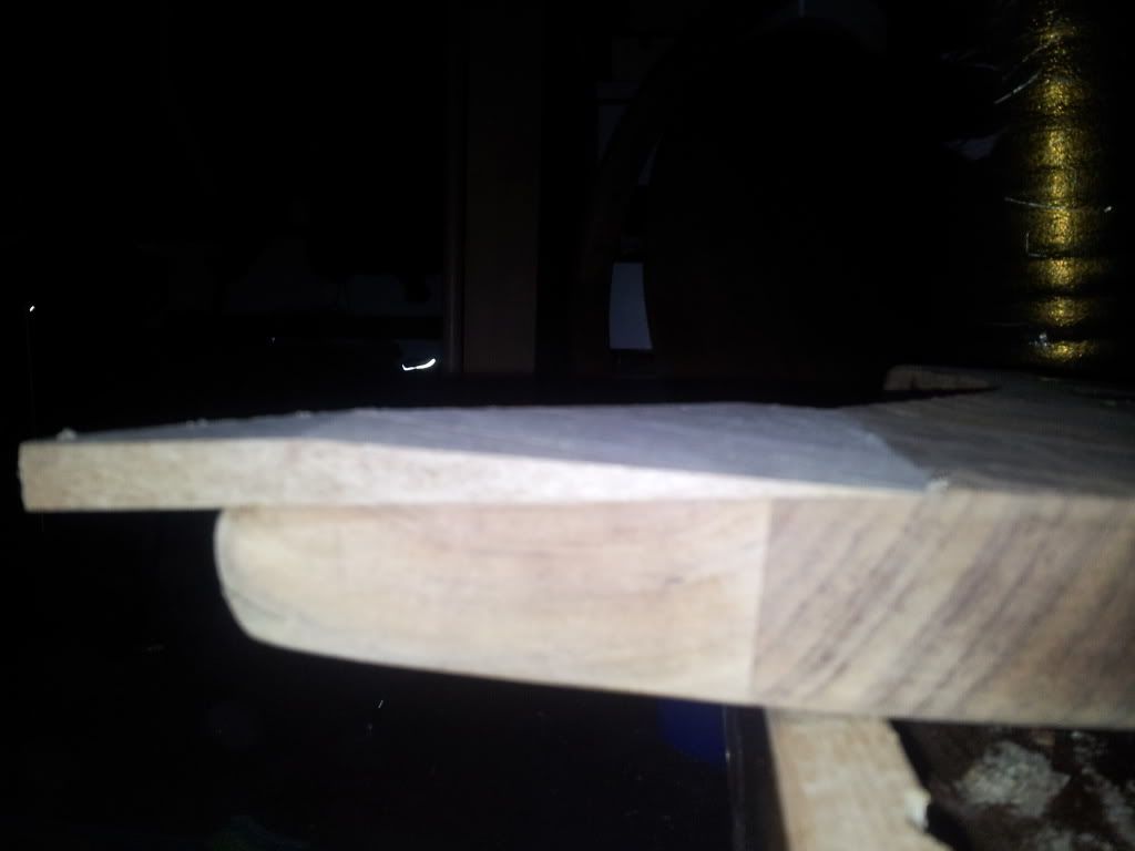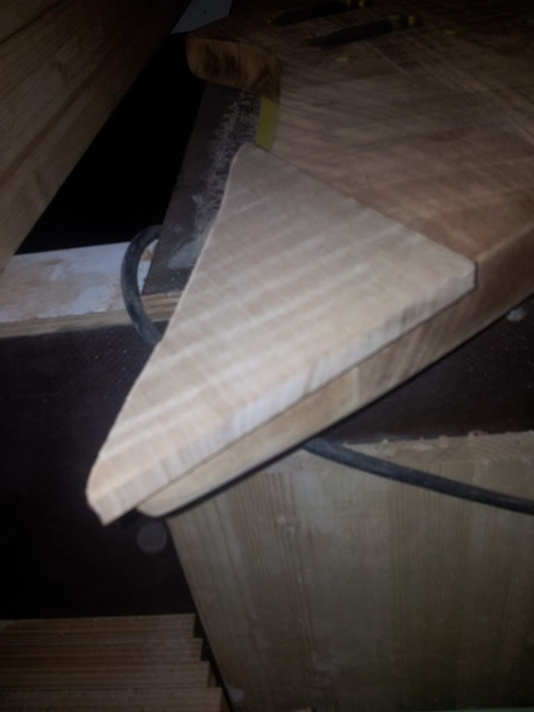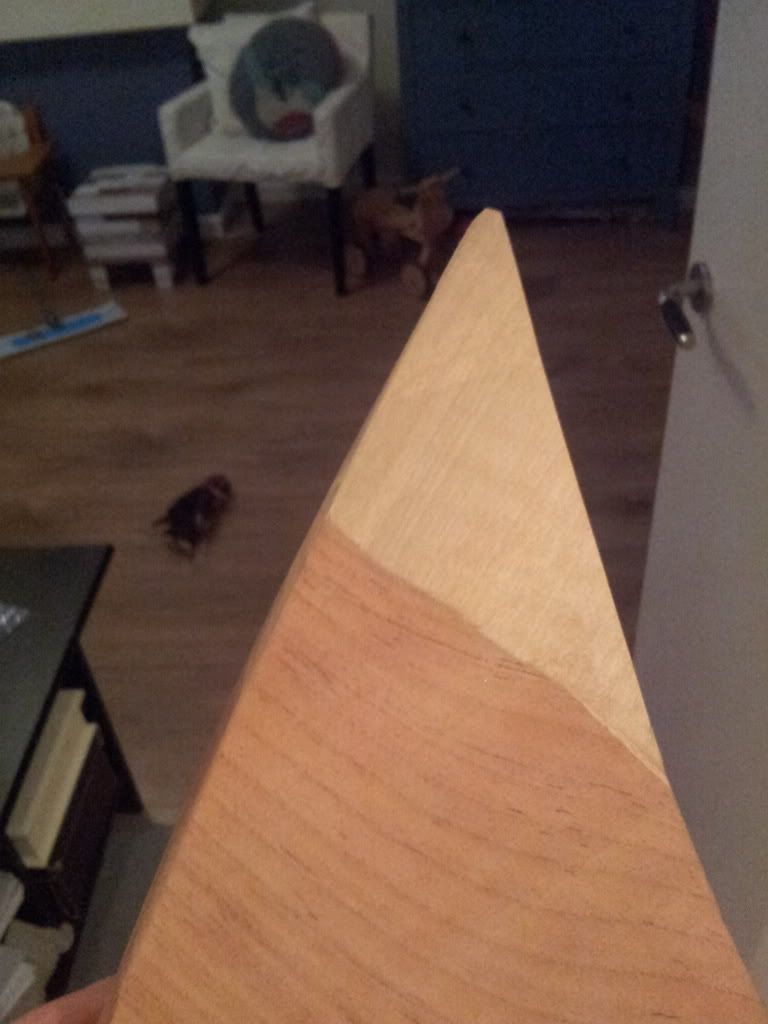 zo, ipv frezen heb ik een "schuurtafel" gemaakt in 20 seconden. dus gewoon schuurpapier verlijmd op een grote vlakke plank. met de hand heb ik net de punt vlak genoeg geschuurd dat er een stuk van de top op gelijmd kan worden. ipv met een radius is de punt nu recht en sluit een te verlijmen stuk goed aan: