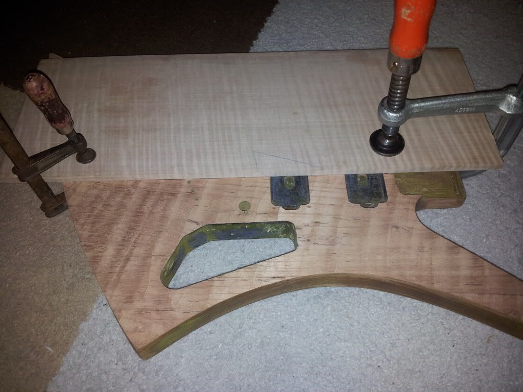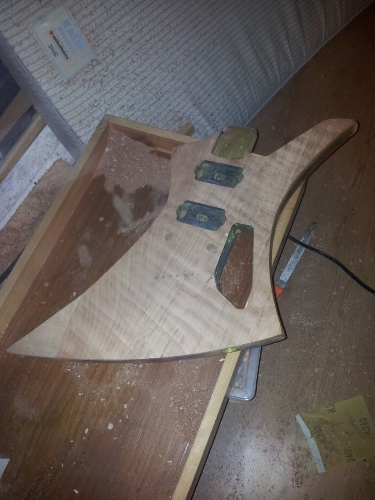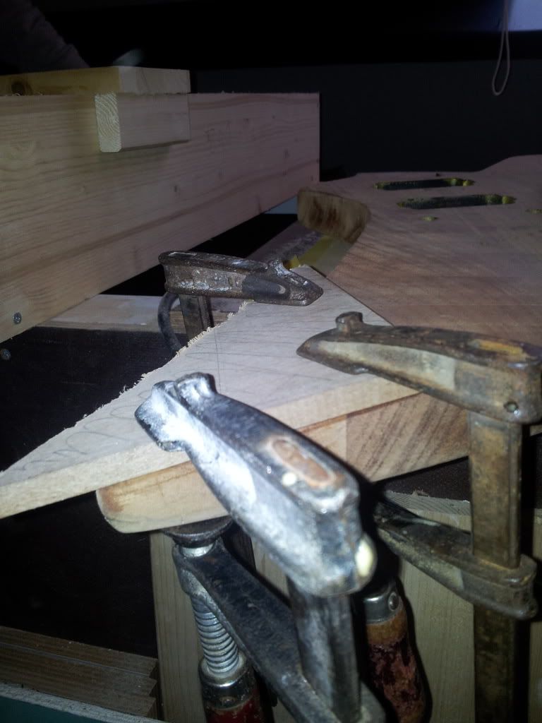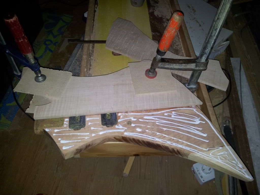 Ben erg blij hoe het tot nu toe loopt. straks nog even de 2 top-helften schuren waar ze op elkaar moeten aansluiten zodat dat zo naadloos mogelijk is. en dan de gitaar goed in 2en verdelen met tape. 1 helft tegelijk verlijmen? ik dacht zelf de HB gaten op te meten en door 2en te delen door een tape-lijn, of merkstift of whatever. Dan 1 helft erop lijmen, en dan blijft de lijn/tape zichtbaar zodat je weet dat alles recht zit.
