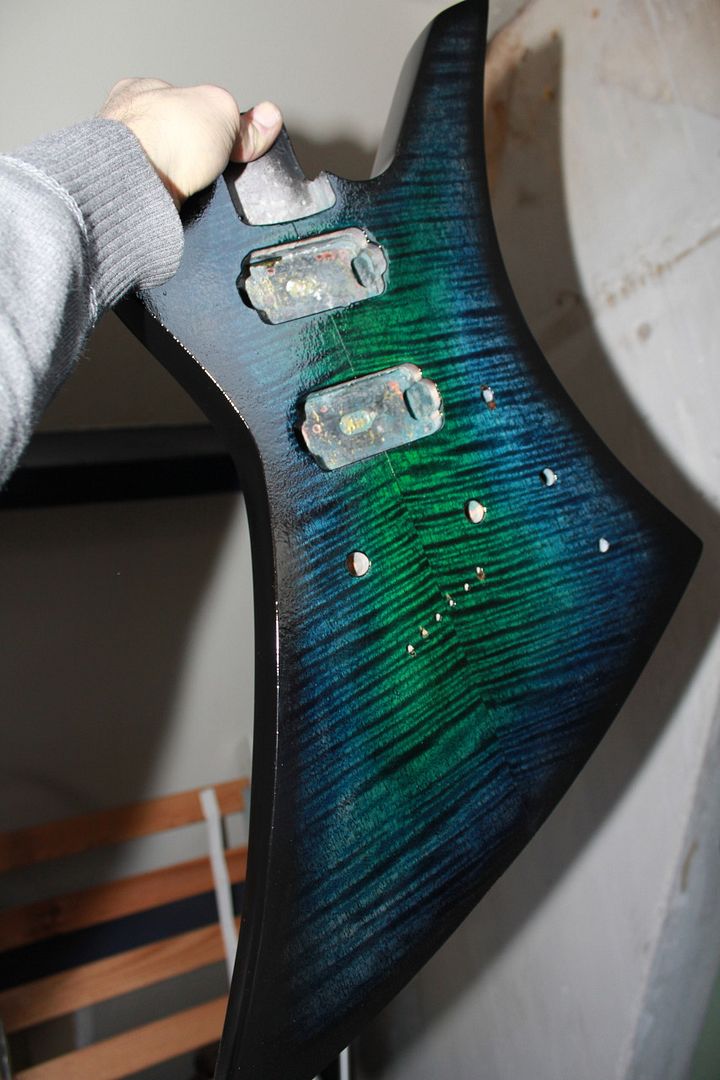 Ik zou de neck zeker zwart spuiten. vind een blanke neck alleen passen bij minder extreme ontwerpen (strat, tele, niet gekleurd hout)