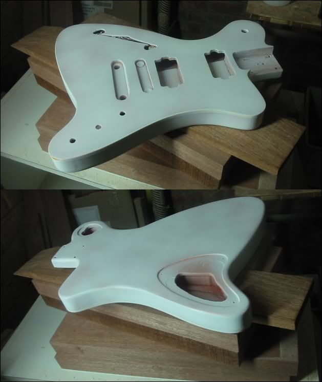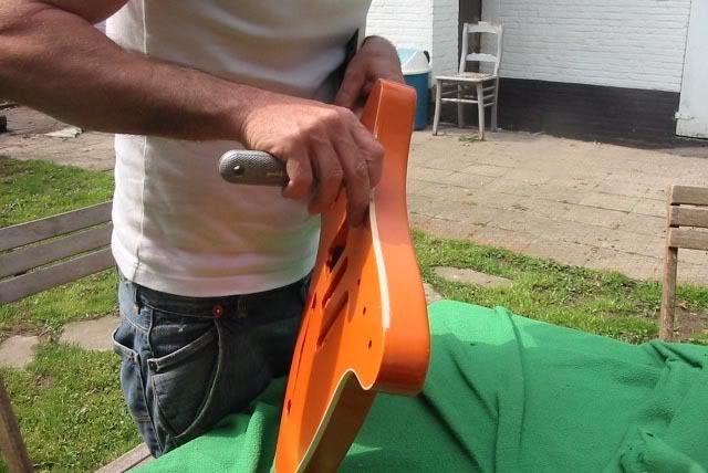 Yeah Sparkle all the way maar niet op de gitaar. de zijkanten en top waren perfect maar de rug zaten na polieren matte plekken op. Dus besliste alles eraf te halen. Ga ze morgen spuiten, het sparlke poeder in de lak mengen. Zou na 3 lagen helemaal bedekt moetten zijn. Heb 2k lijm gebuikt als filler, ingestreken met oude hotel kaart morgen schuren en dan de spuit erop....