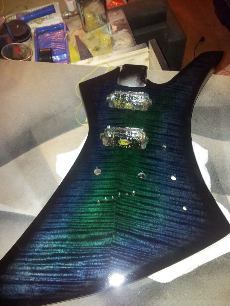 een ander ding: de hals.. in het volle zonlicht zie ik dat ie niet 100% dekkend is aan de randjes. geen probleem, nog 1 keer afplakken en 1 laagje erover heen. hier toch een plaatje waar de halve sidedots te zien zijn:
