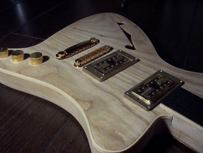 Ondertussen nog wat verder gekomen: neck pocket gefreesd en neckpup ook. Ben niet echt voor goud maar icm ebben heeft het toch iets, vind ik nu. this is gonna be a bling guttlin ...