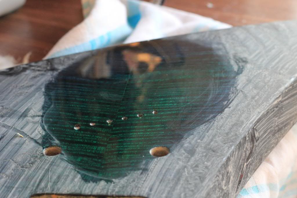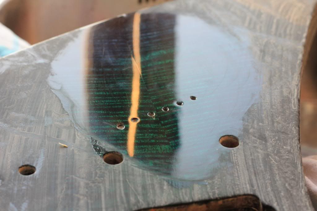 een ander ding: de hals.. in het volle zonlicht zie ik dat ie niet 100% dekkend is aan de randjes. geen probleem, nog 1 keer afplakken en 1 laagje erover heen. hier toch een plaatje waar de halve sidedots te zien zijn: