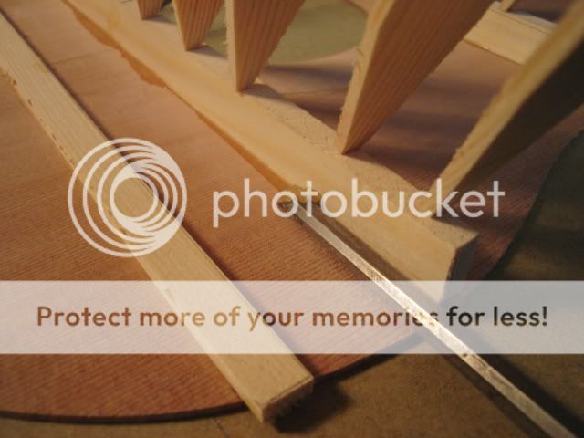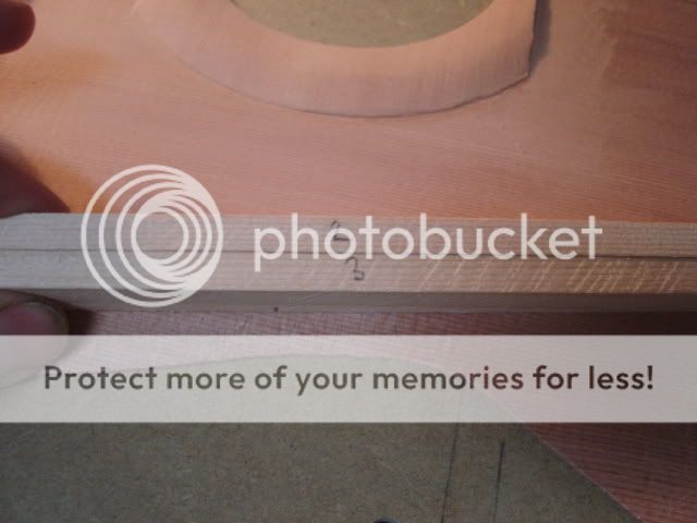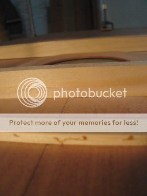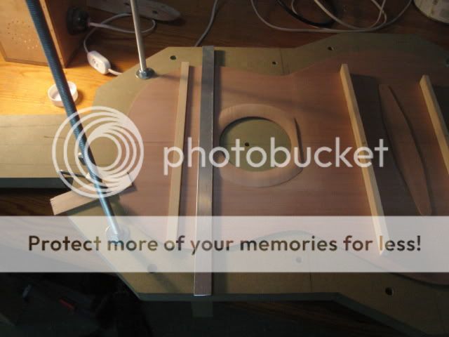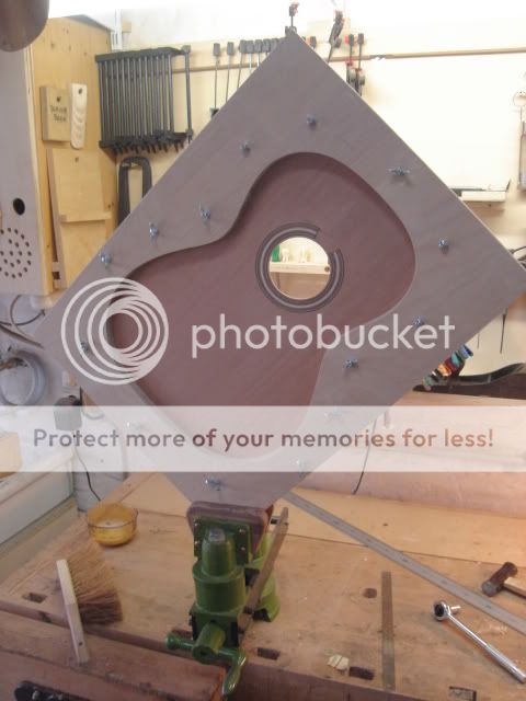 Gisteren avond begonnen aan het lijmen van het klankblad en een deel van de rug van gitaar 1.