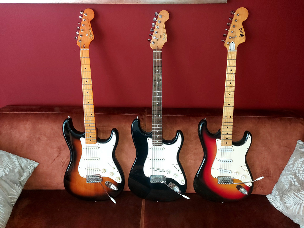 Rechts mijn eerste elektrische gitaar, voor mij uitgezocht door mijn gitaar leraar George Kleefman in 1980, een 1976 Ibanez strat. Een jaar of 15 geleden door Don Hofstee gerestaureerd, oa herfret en shielding. Kostte 500 gulden toen (230€)